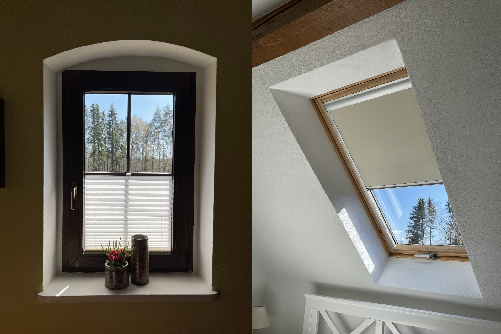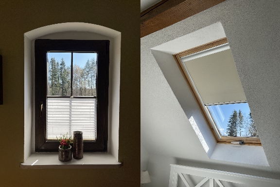 können. Rollos und Plissees in verschiedenen Farben und Mustern